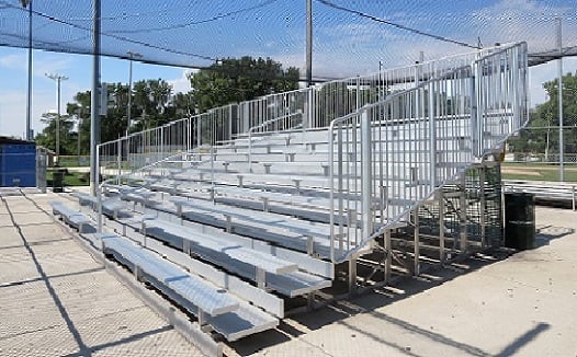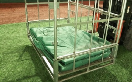 倉庫にしまってあるスタンドをハンドパレットに乗っけて運び、所定の位置に設置し、座席を引き出し、手すりを付けて、完成させます。
